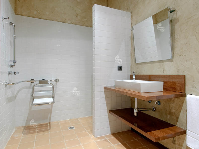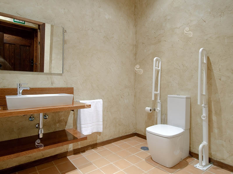 Valoración Accesibilidad Podríamos Recomendarlo para usuarios en silla de ruedas. Aunque debéis tener en cuenta estos dos aspectos: -- La balda de madera debajo del lavabo, dificultará el acceso al mismo de forma cómoda. -- El patio interior, suelo de cantos rodados de piedra e irregular.