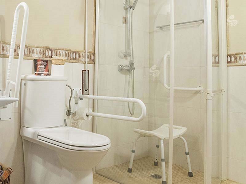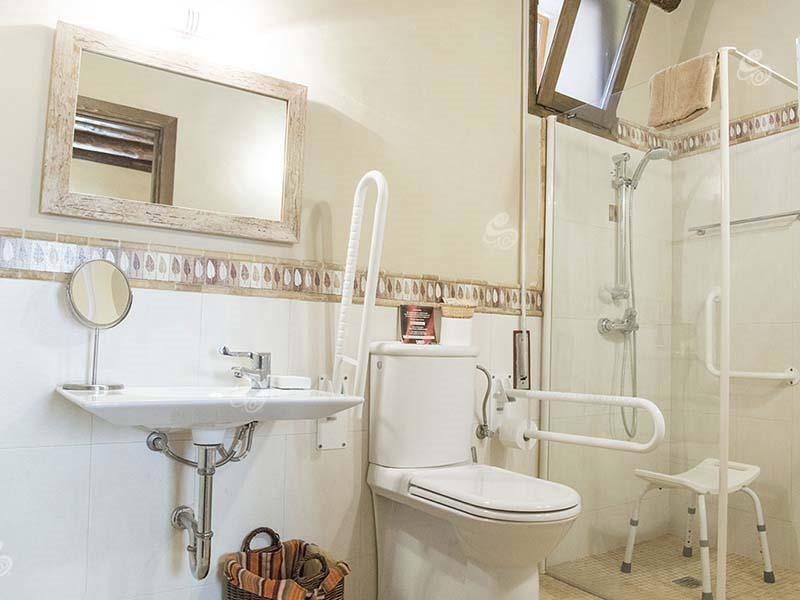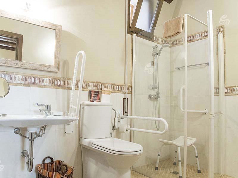 -- La ducha: a ras de suelo con mampara, un apoyo fijo y silla sin respaldo.
