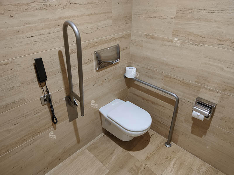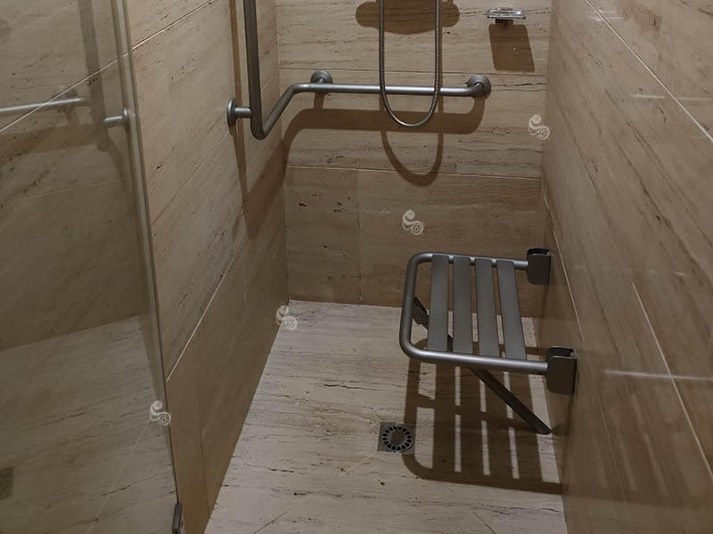 Aseo: -- Lavabo: grifo monomando, fondo libre. -- Ducha: a ras de suelo, con asiento fijo en la pared y con una barra de apoyo una fija. Medidas de la ducha 83 cm de ancho por 98 cm de largo. -- Inodoro: cuenta con dos apoyos: uno fijo y el otro abatible.
