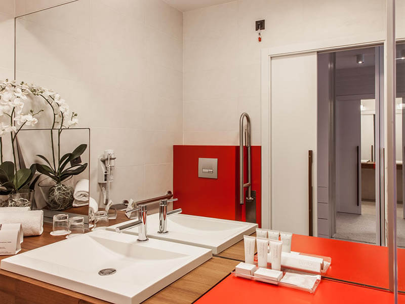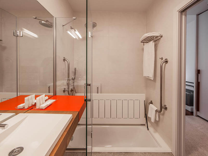 Aseo: -- Lavabo: grifo monomando, fondo libre. -- Ducha: a ras de suelo, con asiento fijo en la pared y con una barra de apoyo una fija. -- Inodoro: cuenta con dos apoyos: uno fijo y el otro abatible.