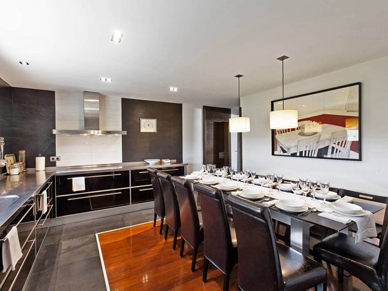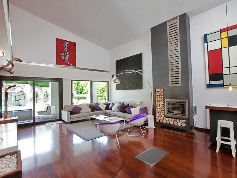 SERVICIOS TV 60"- 4K Smart TV, WIFI - Fibra 50 Mb, Sofá en L para 9 personas, 2 butacas individuales, Grandes ventanales con salida directa a porche, jardín, piscina, Frigo-Combi, microondas, horno, vitrocerámica de 4 fuegos, Lavavajillas, lavadora, Juego de cazuelas, sartenes, olla express, Batidora, tostadora, exprimidor, Juego completo de vasos, tazas, vajilla y cubiertos según necesidad, 2 cafeteras italianas.