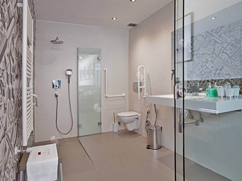 Aseo: -- Lavabo: fondo libre Inferior y grifo monomando. -- Ducha: a ras de suelo, con taburete y con una barra de apoyo fija. -- Inodoro: cuenta con dos apoyos: una barra fija y la otra abatible.