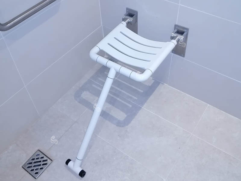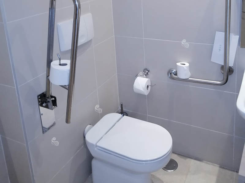 Aseo: -- Lavabo: grifo monomando, fondo libre. -- Ducha: a ras de suelo, con silla fija en la pared, dispone de una barra de apoyo fija. -- Inodoro: cuenta con dos apoyos: uno fijo y el otro abatible.