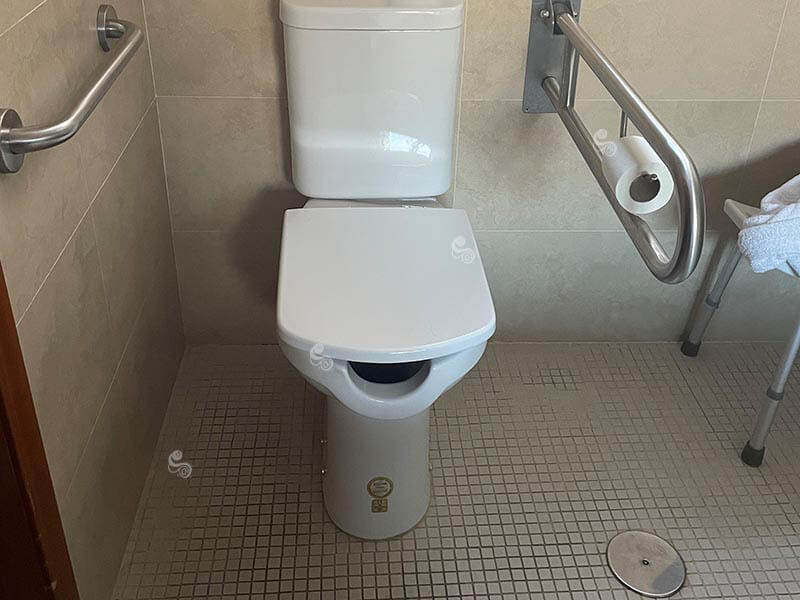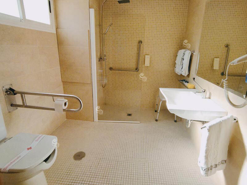 Aseo: -- Lavabo: grifo monomando, fondo libre. -- Ducha: a ras de suelo, hoja de mampara abatible, con asiento sin brazos y regulable en altura y dispone de una barra de apoyo fija. -- Inodoro: cuenta con dos apoyos: uno fijo y el otro abatible.